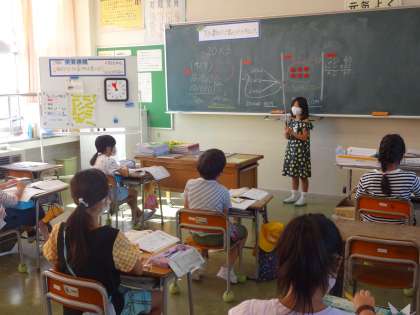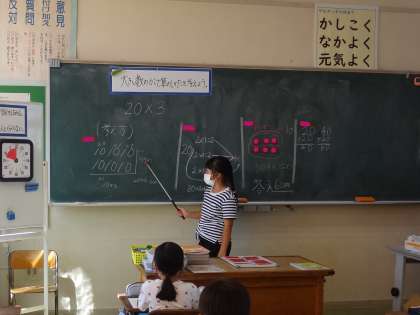 20(円)×3(個)の答えは、60(円)と分かったのですが、計算方法は、いろいろな考え方があります。自分の考えと比べながら友達の発表を聞いています。