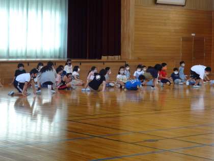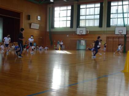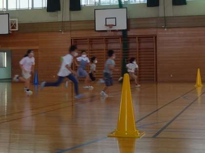 上の写真は、体育館で行った変形ダッシュ走の様子です。