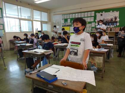 そして、仲間分けの根拠を話し合いました。ほとんど分けることができましたが、まだ見分けるのに悩む図形があるので、次時にもう一度話し合います。