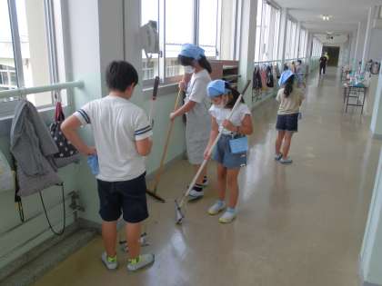 給食、昼休憩後のなかよし清掃は縦割り班で行っています。上学年の子供たちが下学年の子供たちをリードして、みんなで一生懸命に取り組んでいます。きれいな環境で勉強するのは気持ちいいですね。
