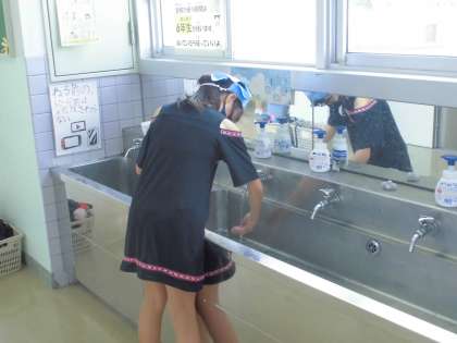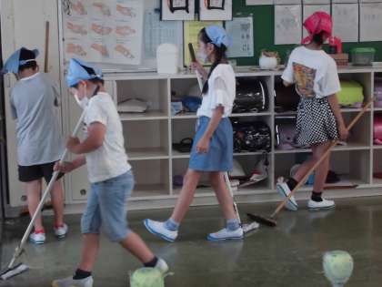 給食、昼休憩後のなかよし清掃は縦割り班で行っています。上学年の子供たちが下学年の子供たちをリードして、みんなで一生懸命に取り組んでいます。きれいな環境で勉強するのは気持ちいいですね。