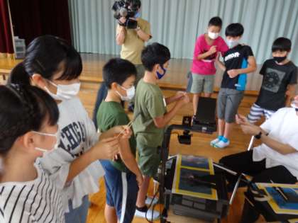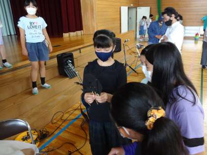 芸術館紹介が終わり、片付け時に、影絵の道具を見せてもらいました。子供たちは、興味津々です。