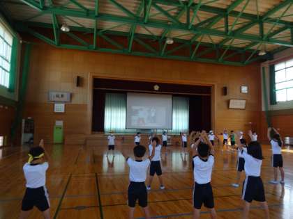 ダンスグループは、体育館で行いました。2年生と3年生が向かい合い、互いの様子を見ながらダンス練習をしました。