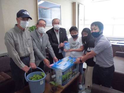 メダカのお世話をする5年生を代表して、2名の児童と担任の先生が受け取りました。これから卵を産んで増えていくことを楽しみにしています。5年生のみなさん、よろしくお願いします。