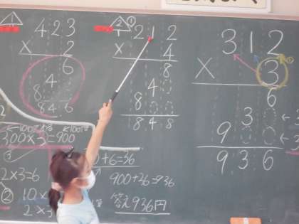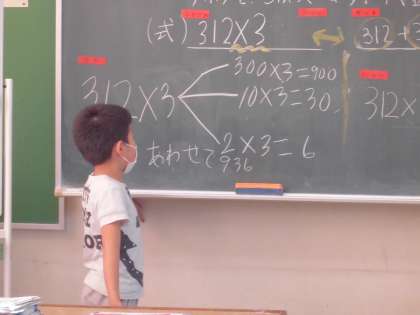 3けたの数と1けたの数の計算を学びました。筆算で計算ができるだけでなく、どうしてそのように計算ができるのか、今まで学んだことを活用して説明しました。