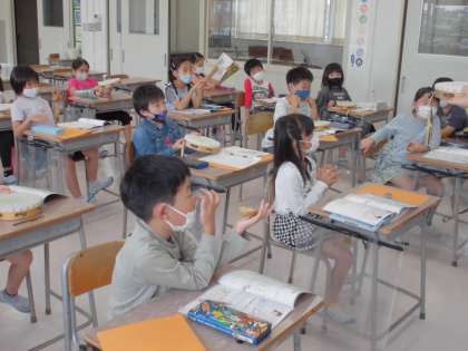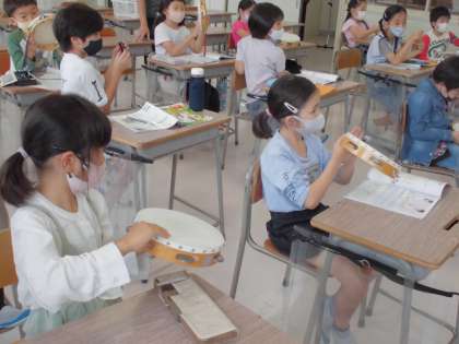 カスタネットとタンバリンの持ち方、たたき方を学び、みんなで2拍子のリズムでたたきました。みんなでリズムに合わせてよい音を出しました。