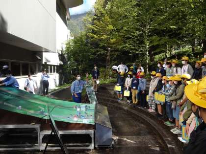 最初に、土石流が起きるとどうなるのか、砂防ダムがある川とない川ではどう違うのか、実験をして教えていただきました。