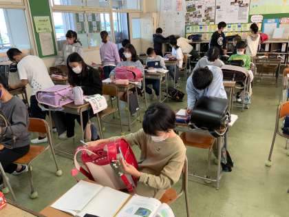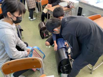 およその体積を求める学習で、自分のランドセルの体積を直方体に見立てて求めました。みんな同じ大きさだと思っていたのが数字で表してみると意外にも差があってびっくり!本当にそんなに差があるのか重ねて比べ合わせました。