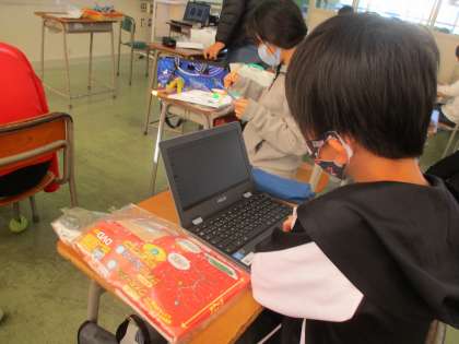 針金を材料として、ペンチやはさみを使い、曲げたり切ったりして自分が思い描いたものを立体的に組み立てていきます。今日はクロームブックを使って、作りたい作品をアプリを活用して描いたり、土台となる台に絵を描いたりしました。