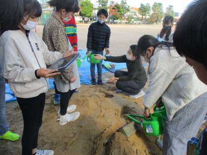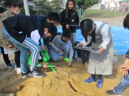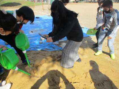 流れる水のはたらきの実験をグラウンドの砂場を使って行いました。前回の実験から分かったことを踏まえて、今日は水の量を前回の2倍にして行い、それに伴い、「侵食」「運搬」「堆積」はどのように変化するのか、クロームブックで記録を取りながら観察しました。前回の実験と比較しやすいように、水路に落ち葉や石を置いて動きや水の威力の違いがあるのか実験するグループもありました。
