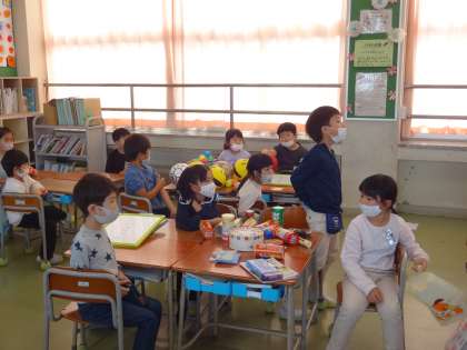 子供たちが家から持ち寄った箱を、形が似ているかどうかで仲間分けしました。どのように考えて分けたかも発表しました。