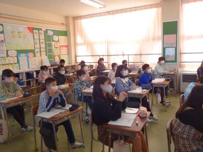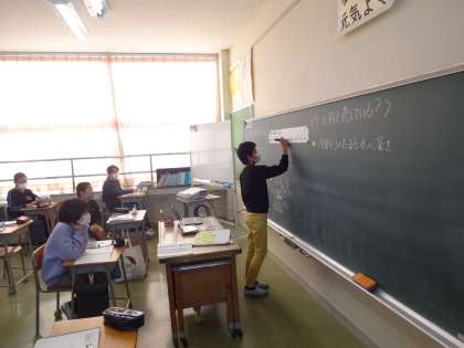 「水を入れる時間」と「水槽の水の深さ」の関係を、比例の式に表す学習をしています。表を見ながら2つの数量の関係について考えたことを、話し合いました。
