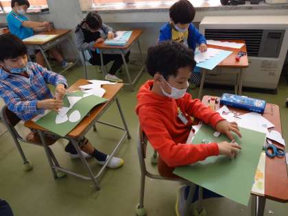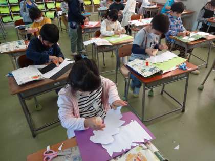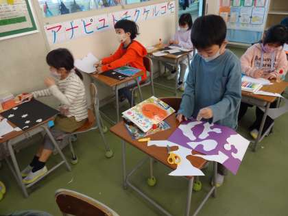 切り取った紙の形を見て、何に見えるか想像を膨らませました。そして、台紙となる色画用紙に貼って、思いつくままに作品作りです。