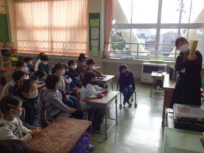 富山市立図書館の職員の方が2名、2年生教室に来てくださいました。6冊の本について、紹介したり読み聞かせをしたりしてくださいました。その6冊は、貸し出し図書として、置いていってくださいました。