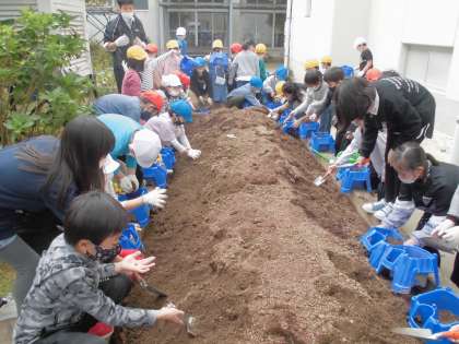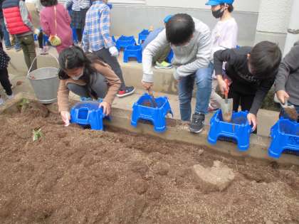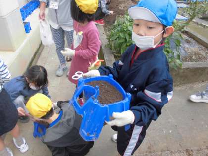 1年生と3年生が合同で、自分の鉢に土を入れて、チューリップの球根を植えました。土を入れる時に、ミミズや何かの幼虫が出てくるたびに悲鳴が上がりましたが、無事に植え終わりました。いろいろな色のチューリップが咲くのが今から待ち遠しいです。