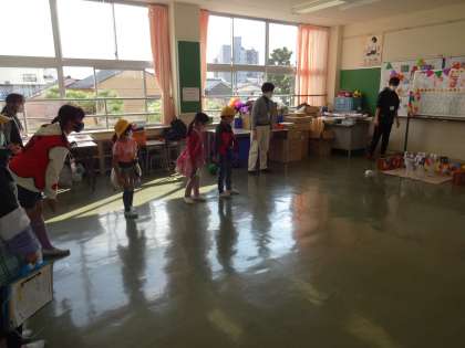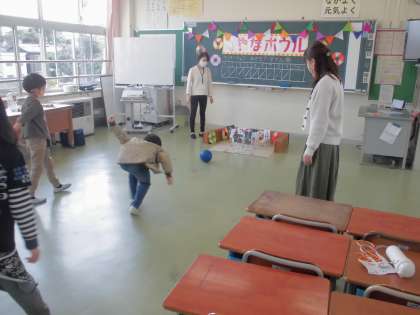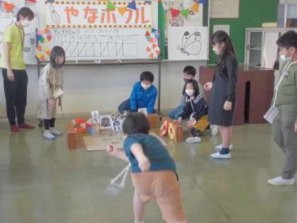 ピンの代わりのペットボトルを狙って投げました。ストライクが出て喜ぶ姿も見られました。