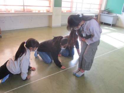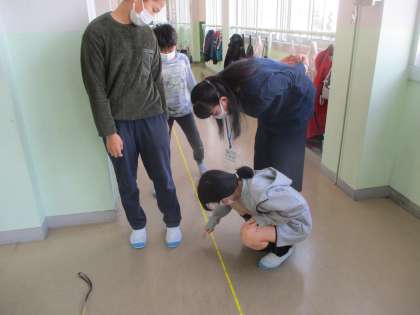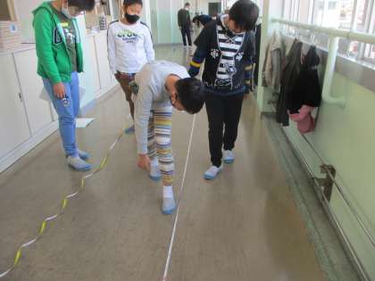 平均の学習を活用して、自分の歩幅の長さを求めました。巻き尺を使い、10歩の長さを3回計測して、10歩の長さの平均を出し、1歩目の歩幅を求めます。1歩目の歩幅を基準にして、教室から図書室までのおよそ道のりや教室からトイレまでのおよそ道のりを計測しました。
