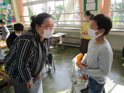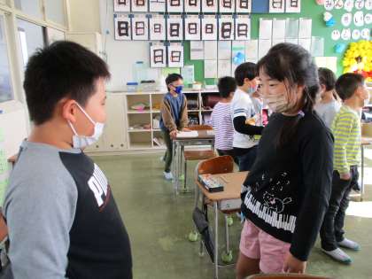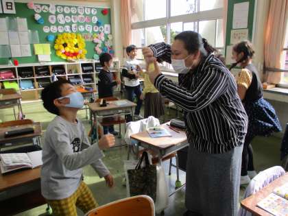 チームに分かれて「ゾンビゲーム」をしました。じゃんけんに勝って自分の仲間が増えて喜ぶ子供や、負けて相手チームに入ることを悔しがる子供の姿が見られました。ALTの先生にも、進んで話しかける子供たちです。