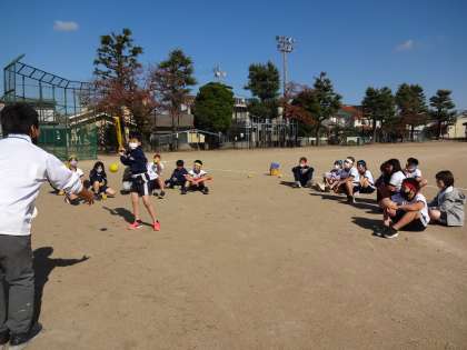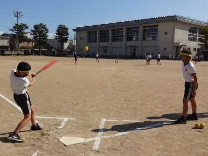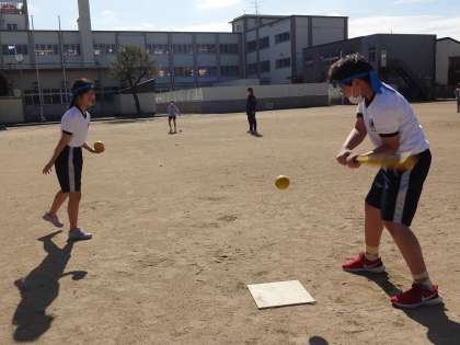 ベースボール型ボール運動の学習を始めました。ボールは、安全性と取り扱いやすさを考え、柔らかくて大きめのボールを使用しています。