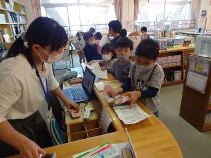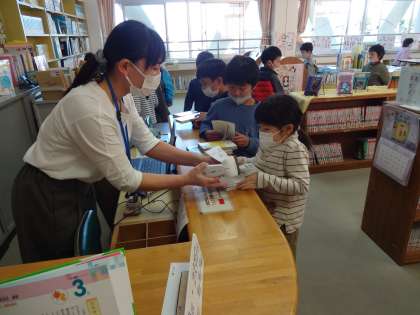 校内読書週間中なので、指定の本を借りて、わくわく読書ビンゴのカードに、スタンプを押してもらっている子供もいました。