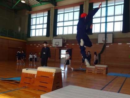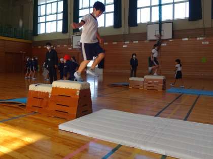 跳び箱を使った運動遊びでは、踏み越し跳び、ジャンプして跳び下りをしています。