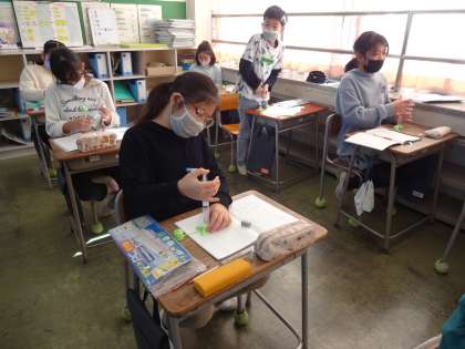 注射器に空気を入れ、閉じ込めました。ピストンをゆっくり押し、空気の体積と手応えの変わり方を調べています。