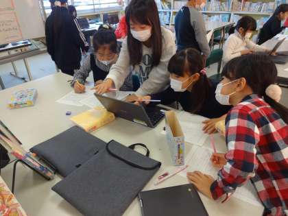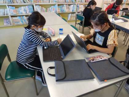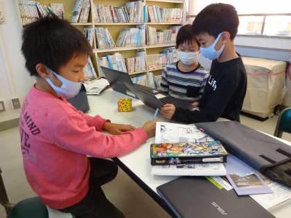 子供たちは、図書室へ行き、富山市の魅力について調べています。図書だけでなかなか見つからず、クロームブックで検索して、記録しています。少しでも多く、自分たちの住む富山市のすてきなところを見付けてほしいです。