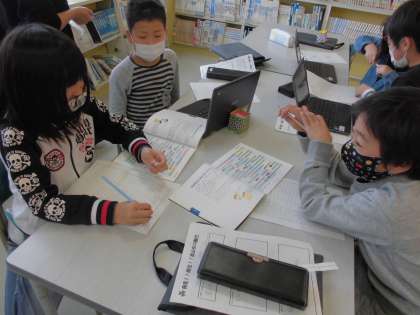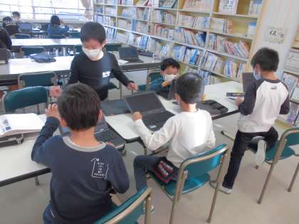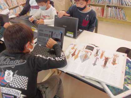 富山の魅力を、クロームブックや本を利用して調べています。ブリ、ホタルイカ、白エビ、ますのすし等、食べ物について調べている児童が多かったですが、富山にはまだまだ魅力がたくさんありますね。