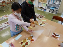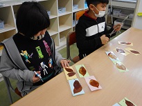 学校で見付けた落ち葉を使って、しおり作りをしました。葉っぱの色や大きさの組み合わせを工夫して、すてきなしおりができあがりました。