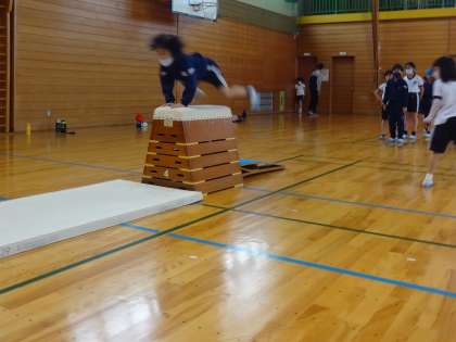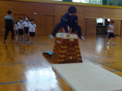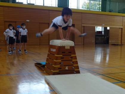 今日は、4段や5段縦の跳び箱を跳んでみました。昨年も挑戦しているので、感覚を取り戻した子供は、何度も何度も軽々と跳びました。