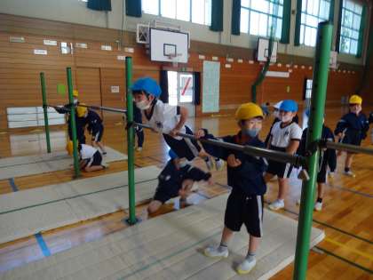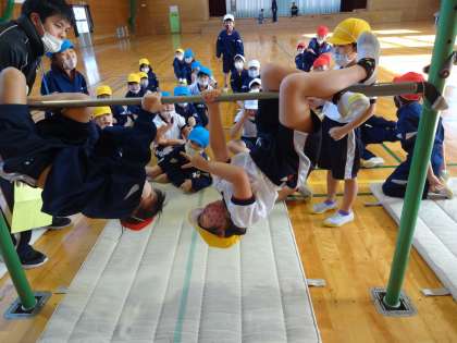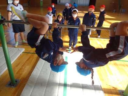 「おさるさん」の技では、友達と息を合わせてぶら下がり、じゃんけんをして楽しみました。長時間でなければ、片手を放しても大丈夫です。