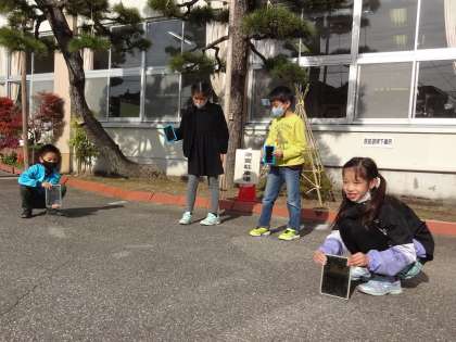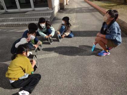 「太陽の光を調べよう」の学習では、太陽光を鏡で反射させ、光の明るさや温度を確かめました。複数枚の鏡の光を集めると、より明るく、より温かくなることも分かりました。