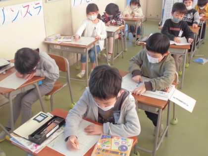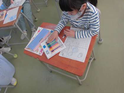 シャボン玉遊びの振り返りを文章と絵でかきました。昨日の5限にたくさん遊んだこともあり、みんな一生懸命書いていました。