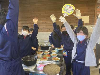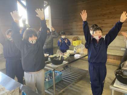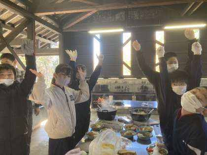 サイレント野外炊飯のカレーライス作りを、見事無事に終えることができました。できた班から「できたー」というかけ声を出します。おもいっきり声を出せた喜びとカレーライスができた喜びをかみしめました。カレーライスは、なんとすべての班が1時間以内に作り終えることができました。