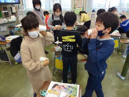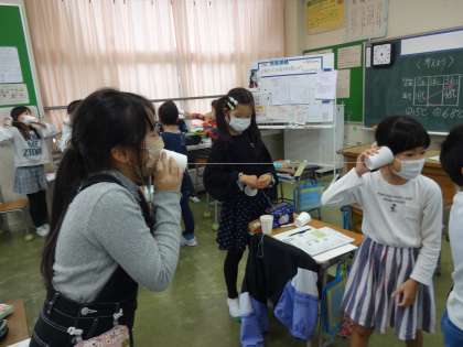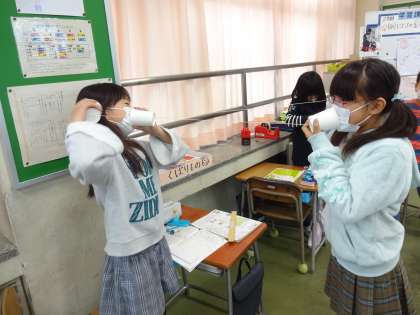 実は、「音のつたわり」の学習をしています。音が伝わるとき、音を伝える物は震えているのかを、ペアで仲よく調べています。