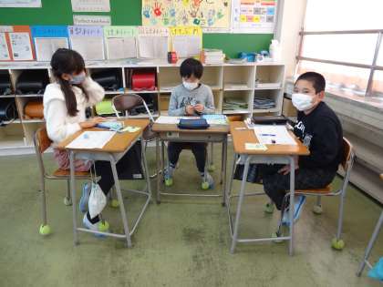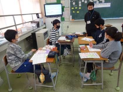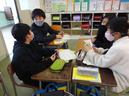 社会科で「自然災害を防ぐ」の学習をしています。国や都道府県の津波対策は、安心できるかどうかについて各自が考えをもち、グループで交流しています。