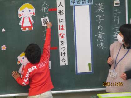 「にんぎょうにはなをつける」という文章を見せると、「どっちのはな?」「こっちのはな!」と次々に子供たちが話し始めました。言葉だけでは伝わらないので、ジェスチャーが加わりました。「花」と「鼻」。同じ読み方でも、意味が全く違うことが分かります。