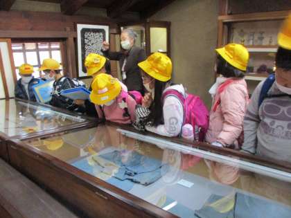 昼食後は、2グループに分かれて、民芸館と民俗資料館の見学をしました。どちらの建物も、古くからあるもので、大正・昭和の時代に実際に使っていた道具も見せていただきました。民俗資料館で見た、昔のアイロンは、「金属の入れ物に炭火を入れ、その熱と重さで布のしわをのばしていた」ことを知り、子供たちは大変驚いていました。