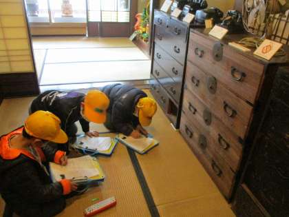 昼食後は、2グループに分かれて、民芸館と民俗資料館の見学をしました。どちらの建物も、古くからあるもので、大正・昭和の時代に実際に使っていた道具も見せていただきました。民俗資料館で見た、昔のアイロンは、「金属の入れ物に炭火を入れ、その熱と重さで布のしわをのばしていた」ことを知り、子供たちは大変驚いていました。