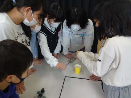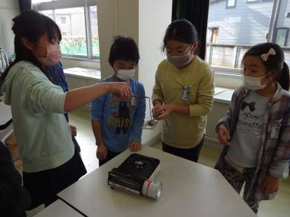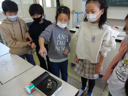 結果が出るのを楽しみにしながら、「湯で温める」「ガスコンロで熱する」「水で冷やす」の3つの実験を協力して行いました。