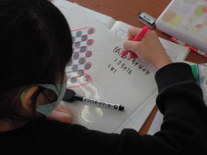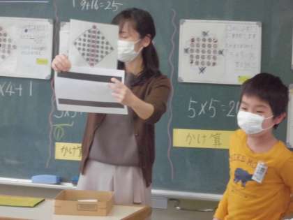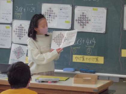 ドット(点)の数を1つの式で求める方法を、既習事項をもとに考えました。発表では、線で囲まれた図を見せて、発表者がどんな式を作ったのかみんなで考えました。