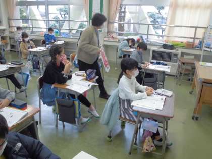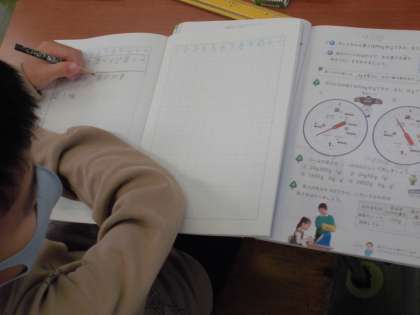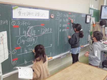はかりの重さを読み取りました。また、kg(キログラム)をg(グラム)で、g(グラム)をkg(キログラム)で表すことを学びました。発表する場面では、積極的に手を挙げました。