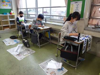 書き初めの練習をしました。今年度は、「初日の海」を書きます。