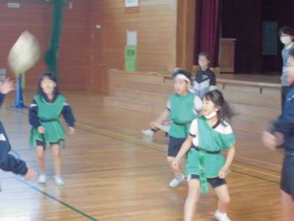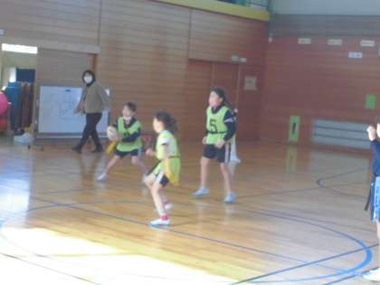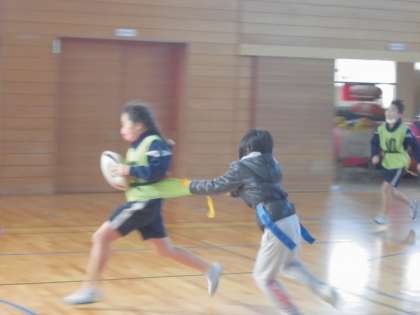 タグラグビーをしました。まずは、パスの練習を行い、その後3対3で試合をしました。思うようにパスがつながらない場面もありましたが、楽しく取り組めました。