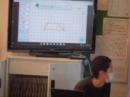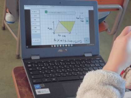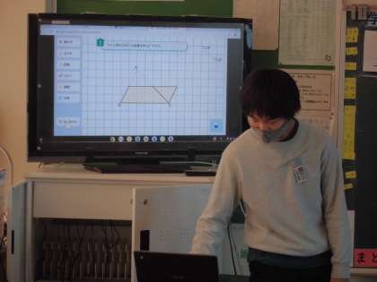 三角形の面積の求め方を考えました。クロームブックで、三角形を平行四辺形や長方形に変形して考えて発表しました。今日の学習が、三角形の面積の公式につながります。