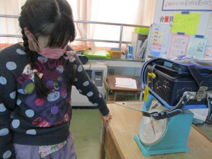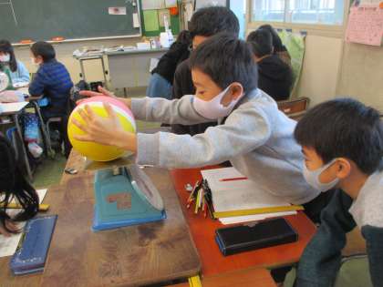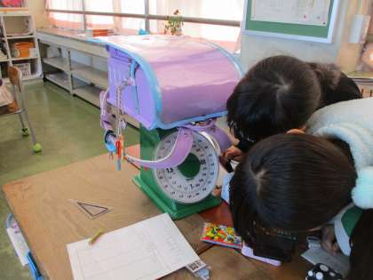 今日は、グループに分かれて身の回りの物の重さを量りました。量りたい物の重さの見当をつけてから、実際の重さを量りました。