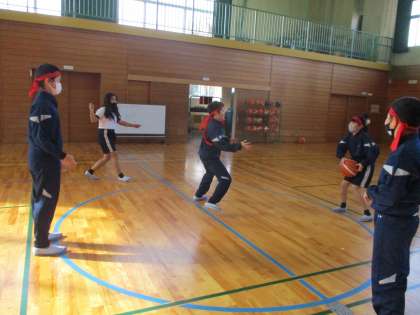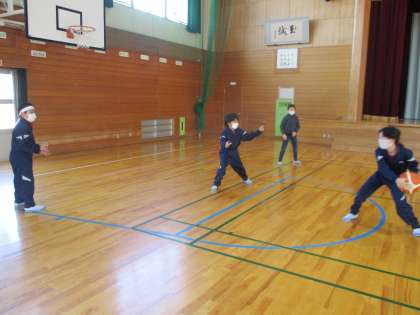 各団のメンバーが4対1に分かれて、円内に入った1人の友達にボールを捕られないようにパス練習をしました。円外にいる4人は円内にいる友達にボールを捕られないようにフェイントをかけたり、相手の動きを見たりして仲間にパスをします。円内にいる児童は、相手の動きを予測して、ボールを奪います。数をこなしていく内に、自然フェイントがでるようになったり、パスカットをできるようになったりしていきました。