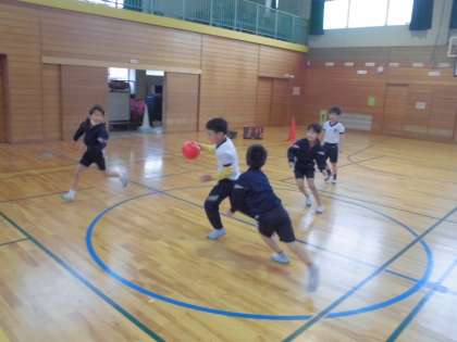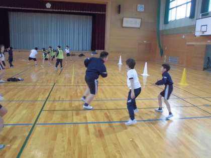 タグラグビーをしました。チームで作戦を考えて試合に臨むなど、意欲的に取り組みました。試合では、相手がいたときに、後ろにいる味方にパスをすることが少しずつ上手になってきました。