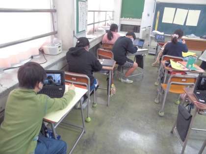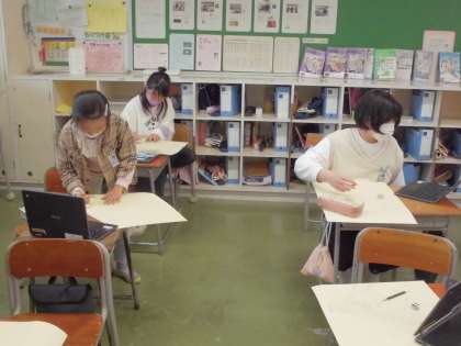 クロームブックを利用して、自分の思い出の中の忘れられない気持ちを自画像に描いています。見た人に気持ちが伝わるように、とても丁寧に描いています。