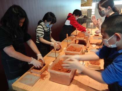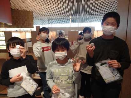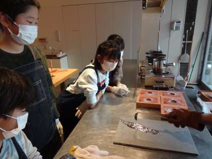 写真はA班の製作体験の様子です。決められた形に専用の砂を敷き詰めていきます。形ができたところに、溶かした錫を流し込み、冷やして完成です。溶けた錫がすぐに固まる様子や固まった錫が自由自在に形を変える様子を見て、驚く姿が見られました。